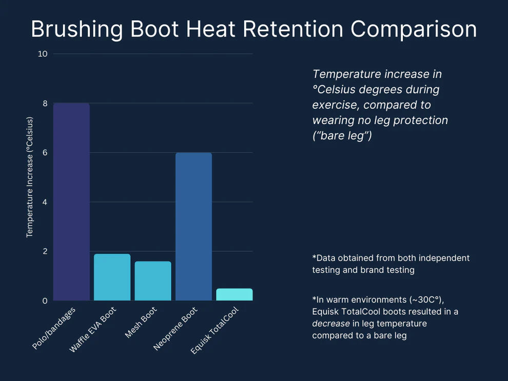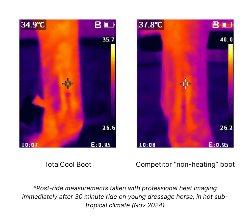 Extensive testing has shown that these boots lead to a maximum of 1°C increase in soft tissue temperature during exercise, and in warm environment testing, results show that legs wearing TotalCool boots maintain a cooler temperature than a bare leg.